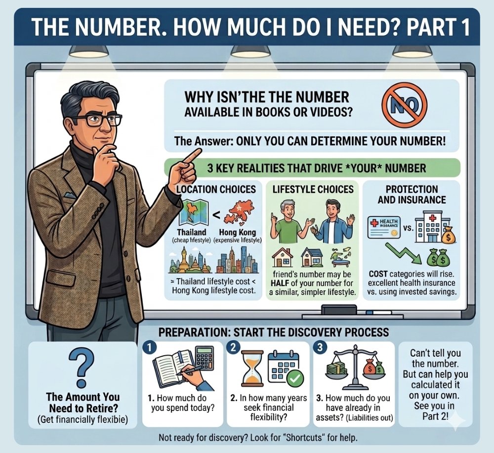 I get it. All our lives we are trained to work towards numerically clear goals: ‘chasing the number.’ And it is reasonable to ask an expert. What IS that number? And why isn’t it easily available in books and the scores of personal finance videos out there?Â